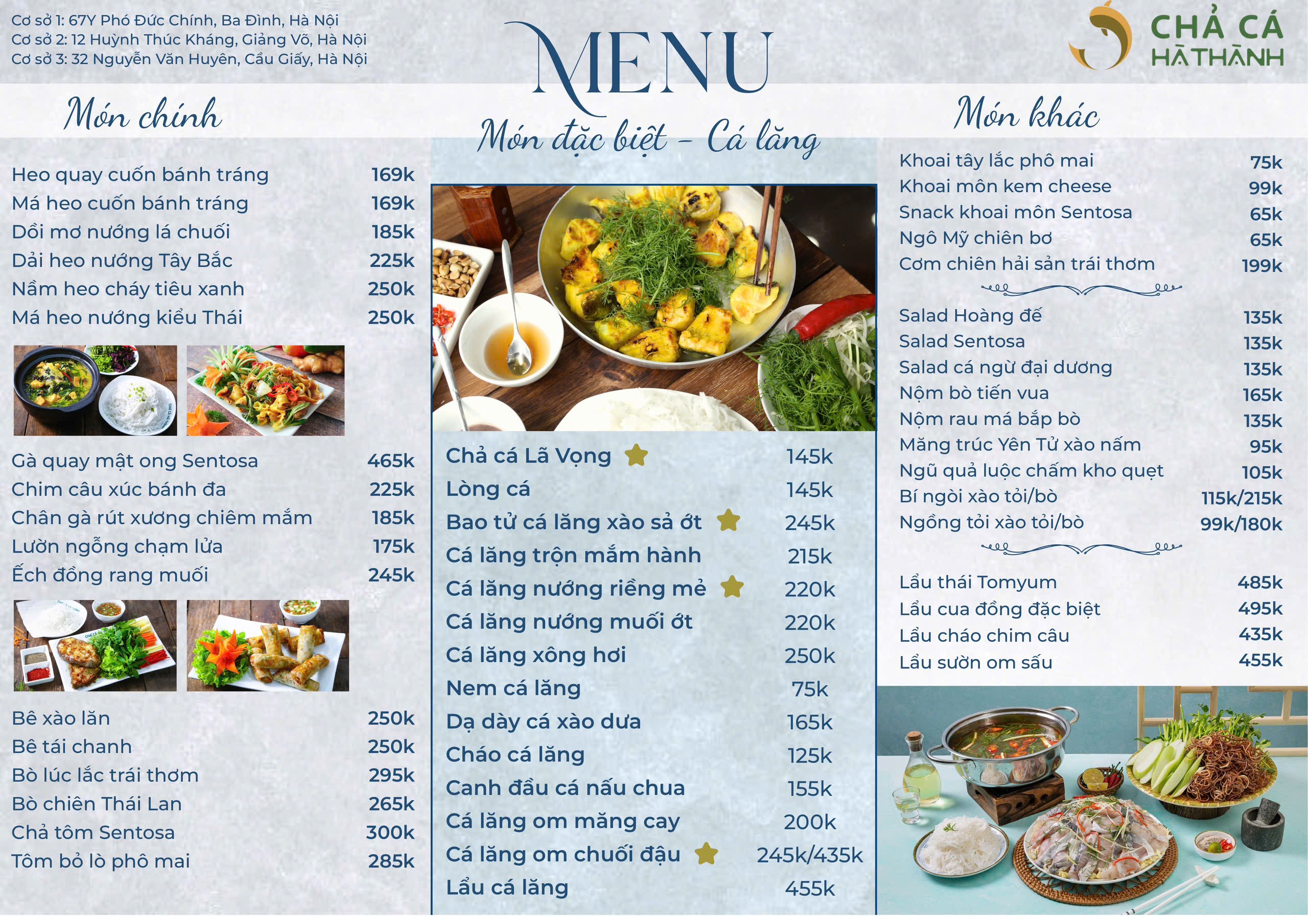 Các món được chế biến từ cá Lăng chính là điểm mạnh của nhà hàng Chả cá Hà Thành: chả cá lã vọng, cá nướng, canh cá, cháo cá…tất cả đều được chế biến bởi đôi bàn tay của những đầu bếp tài hoa, đầy kinh nghiệm, chắc chắn sẽ làm thỏa mãn vị giác và hài lòng ngay cả những thực khách khó tính nhất.